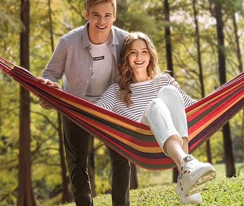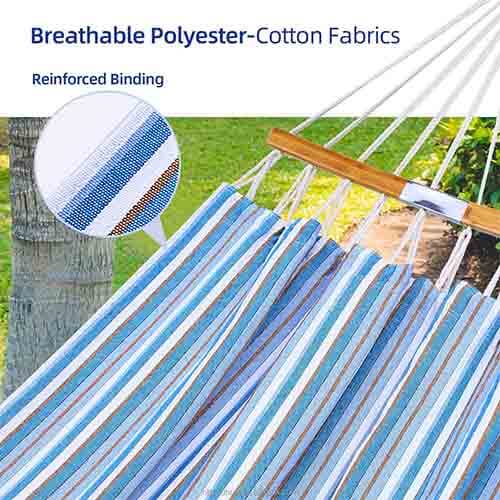 Unlike nylon, polyester hammocks are not too stiff to lie on and offer decent comfort. They’re also lightweight, dry quickly, and easy to clean, a good choice for extended use. Manufacturers often blend polyester with cotton to make hammocks more breathable.